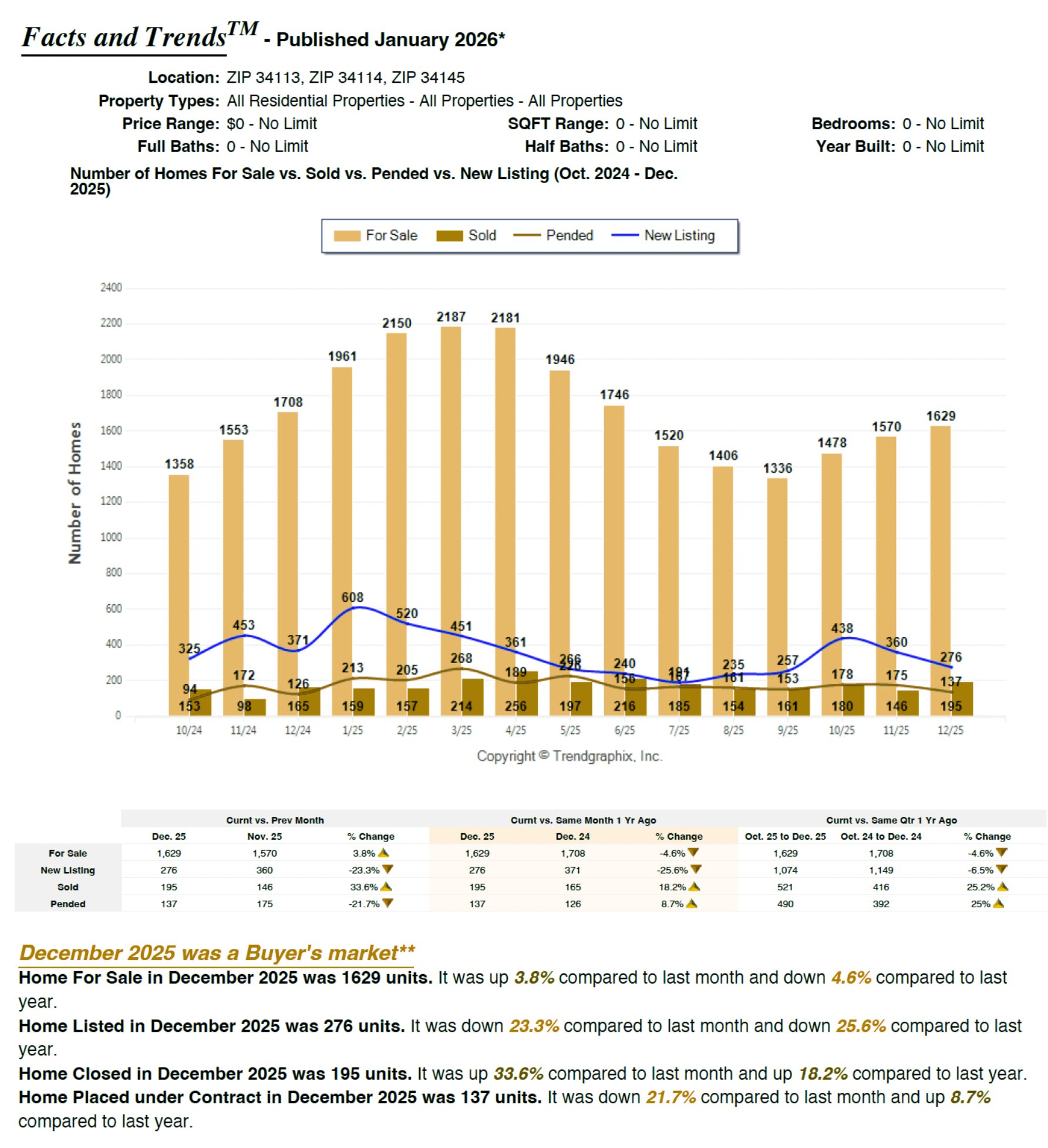 With 2025 officially closed, December’s data offers a clear picture of how the Marco Island real estate market finished the year. Below is a recap of the December 2025 Market Graphics and 15-Month Trend Charts for Marco Island and surrounding areas, including zip codes 34145, 34114, and 34113.