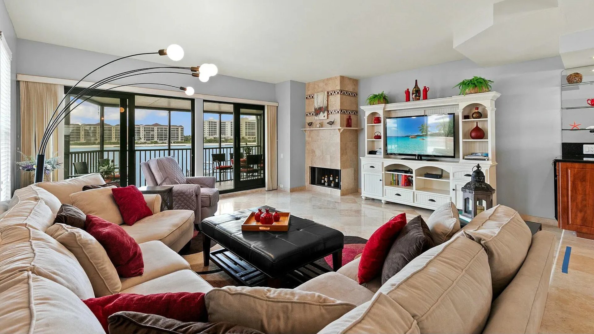 The remodeled kitchen showcases contemporary cabinetry and lighting, while the bathrooms feature updated fixtures and warm travertine tile. Oversized sliding doors open to a private balcony where dolphins and boats drift along the Marco River.